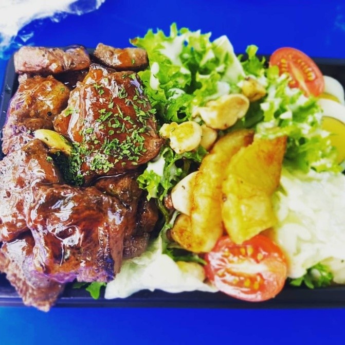 부채살 스테이크 도시락, 돼지목살 스테이크 도시락, 샐러드 (양상추,적근대,치커리) / 삶은계란 슬라이스 / 고구마퓨레(필라프로 교체가능) / 토마토 / 버섯 / 파인애플 / 밥